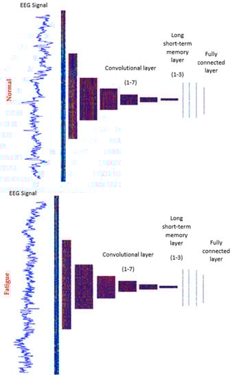 Second, to demonstrate what each layer could ‘sees’ in the proposed deep CNN–LSTM network for a sample of normal and fatigue states, the reactions of neurons of convolutional, LSTM, and FC layers were visualized. As shown in Figure 17, the size of the feature maps decreased with the exception of the first four layers, as the layer deepened. The powerful discriminating features learned from deep layers suggested the reasonableness to build a deep CNN–LSTM.