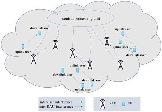 It has been proven that the system capacity can be improved by accepting the full-duplex (FD) model. Compared to the conventional half-duplex (HD) system, it may double capacity [13,14]. In [15], D. Wang has proposed an FD framework named network-assisted full-duplex (NAFD), which is mainly discussed in this paper. In this NAFD system, all the remote antenna units (RAUs) and users are randomly distributed in a large area. The Rayleigh fading model is adopted as the small-scale channel model; that is, the channel vectors are independent and obey Rayleigh distribution. In addition, as mentioned above, the centralized cell-free massive MIMO system allows both uplink and downlink baseband signals being processed at the central processing unit (CPU), which indicate that the CPU could acquire the signals in advance after precoding for all the downlink users. This reveals that it is possible to realize the DL-to-UL interference cancellation in the digital domain. By utilizing the existing HD hardware devices, an in-band FD network could be established under a cell-free massive MIMO system, which explains the concept of NAFD [15]. It cannot totally cancel the interference of transmitted RAUs and received RAUs, while basically all RAUs still work in a mode of half-duplex in our described NAFD network system. Hence, the self-interference of an FD RAU is out of our consideration. The transmission power of uplink user equipment (UEs) and transmitter RAUs should be at the same order of magnitude, which is caused by the random and even distribution of all the UEs and RAUs. Based on this assumption, the energy efficiency of an NAFD network could be further improved and the DL-to-UL interference mitigation could also be guaranteed. The spectral efficiency of an NAFD network with cell-free massive MIMO system has been analyzed in [15]. However, [15] did not consider that the great number of UEs may cause pilot contamination, which is the theme of this paper. In [16], authors derived a closed-form expression of spectral efficiency with pilot contamination. By maximizing the aggregated uplink and downlink spectral efficiency with constraints of quality-of service (QoS) and backhaul, [17] designed a method to perform joint downlink beamforming and power control for an NAFD network system. In [18], a transceiver design algorithm is studied with the consideration of maximizing the spectral efficiency while limiting the QoS and backhaul.