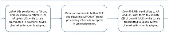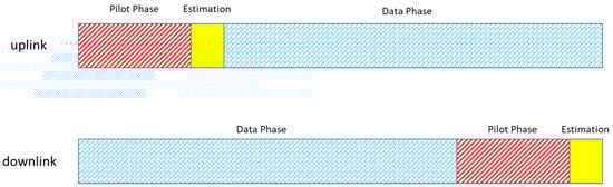 Our transmission scheme is illustrated in Figure 2. A complete transmission cycle is divided into pilot phase, estimation, and data phase. The pilot sequences are sent by uplink or downlink UEs in pilot phase, but not simultaneously. In the estimation phase, the CSI will be estimated according to the received pilot sequences from UEs in the base station. The data phase is regarded as the main transmission period, in which the uplink data signals will be sent to the receiver RAUs by uplink UEs, or the downlink data signals that sent by transmitter RAUs will be received by downlink UEs. Without loss of generality, we assume that the estimation phase is very short and negligible. In both the downlink and uplink channel, the same time-frequency resources are utilized to transmit signals.