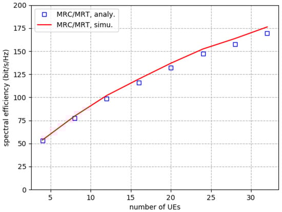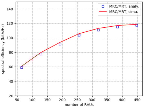 As illustrated in Figure 3, the theoretical and simulated spectral efficiency are compared against the number of RAUs increasing, while the MRC/MRT signal processing scheme is adopted. In this simulation, we set the number of RAUs to vary from 64 to 448. We can see from this figure that the accuracy of asymptotic expressions (19), (31), and (39) are validated, and with the increase of the RAUs’ number, the sum rates are increasing logarithmically, which means the increasing rate of spectral efficiency will be slow.