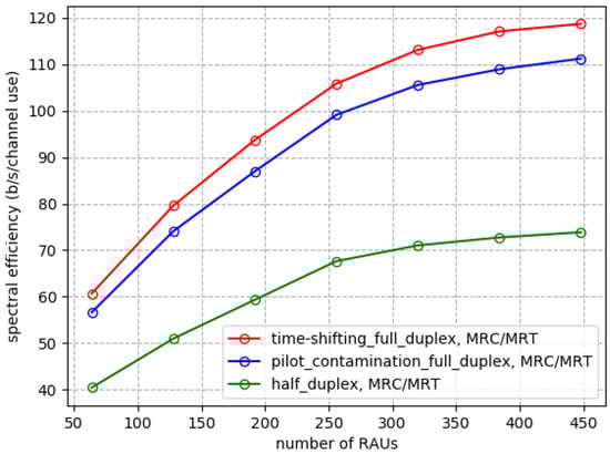 We could conclude from Figure 6 that by increasing the number of RAUs, the spectral efficiency of both NAFD and TDD systems will increase logarithmically. However, compared with the TDD system, the NAFD system apparently has a better performance. This indicates that a half-duplex system can be less spectral-efficient than a full-duplex. Moreover, in an NAFD network system, the time-shifting scheme has a higher spectral efficiency than pilot contamination under the same situation.