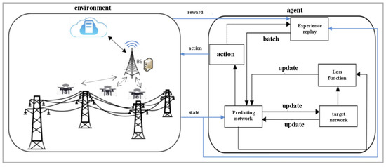 The agent in the edge server interacts with the edge computing environment. In each time slot, the agent observes the environment and obtains x ( n ) = { D , W , q , η } , where D is the information of the drone, W is the number of tasks, q is the communication resource of the edge server, and η is the computing resource of the edge server.