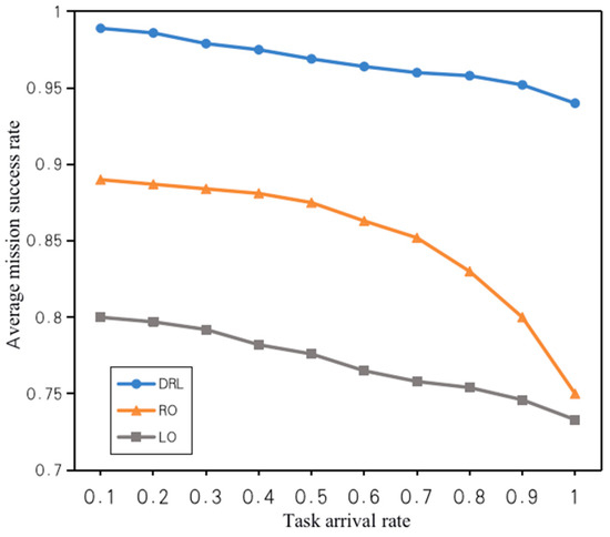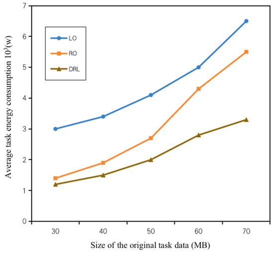 Figure 4 shows that the proposed DRL offloading strategy has significantly less UAV energy consumption than the locally executed and random offloading strategies. This is mainly because the LO algorithm consumes a lot of computing energy consumption of the UAV, and the RO offloading strategy will also consume a lot of communication energy of the UAV, which will greatly shorten the flight time of the UAV. The DRL offloading strategy is proposed based on the three-layer architecture, and the communication situation is considered in the computational modeling, so the energy consumption of the UAV is greatly reduced.