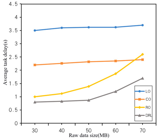 As shown in Figure 3, because the computational power of UAVs is usually insufficient, the locally calculated response time does not meet the maximum time delay requirements for a large number of tasks to be processed, so the user average time delay increases with the raw data size. Compared with the LO, RO and CO algorithms, the average delay of the DRL offloading strategy was not significant. The CO algorithm unloads all tasks to the cloud for execution. Although the cloud server is rich in computing resources, long-distance transmission requires long transmission delay. Secondly, although the LO algorithm saves the transmission delay and the waiting delay, it will also increase the execution delay due to the limited computing resources of the UAV. Although the edge server can perform multiple tasks simultaneously, its random allocation of resources causes the offloading algorithm to reach the optimal policy of edge service offloading, so the RO algorithm delay is higher than DQN. It is worth noting that because the computational power of the edge server is limited, the user average service delay will be higher than the CO algorithm when the size of the raw data is greater than 60 MB of the algorithm. This is mainly because the delay generated in the data transmission has an impact on the DRL. With the development of communication technology, it is hoped that the data transmission delay can be reduced in the future. Compared with the three offloading algorithms of LO, RO and CO, the average task completion delay of the offloading strategy proposed in this paper is reduced by 54%, 26%, and 37%, respectively.