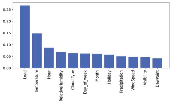 After analyzing the performance of the model, we elaborated on the interpretability of the proposed model. To interpret the prediction results, we first calculated the global variable importance of the mixture attention mechanism by Equation (15). Variable attention can distinguish the significance of variables by the attention score. The global variable importance results are shown in Figure 4. The horizontal axis represents the input variable, and the vertical axis is the global feature importance score of the input variable. It can be seen that the three factors that have the greatest impact on load forecasting are the autoregressive variable—load (accounting for 0.27), temperature (accounting for 0.15) and hour (accounting for 0.09). As expected, historical load is the most important input variable, as these values contain the richest information about the prediction. Temperature is also an important factor affecting the electrical behavior of residential customers.The higher the temperature, the less comfortable the living environment is. As a result, the air-conditioning system will be turned on to meet comfort demands, increasing electricity usage. In addition, time-related variables also contribute to model predictions. In fact, the residential load profile has a certain degree of periodicity, especially the daily periodicity. Therefore, the hour variable can represent a fixed behavioral pattern of customers. In contrast, the information contained in other external variables, such as wind speed, visibility, dew point, etc., is of little value.