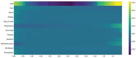 Next, we analyzed the variable-wise temporal importance of the mixture attention mechanism in load forecasting. Figure 6 shows the variable-wise temporal importance results calculated by Equation (16). The rows of the matrix represent the past time steps of the predicted point, and the columns represent the input variables. It can be seen that the importance of the load changed dramatically over time. The load in the last few hours contributed the most to the prediction. This is because the power consumption has a significant lag effect. At the same time, the load at the same moment of the previous day also has a great influence on the prediction. This is related to the periodicity of residential electricity consumption behavior. Changes in temperature also have a greater influence on the load prediction. The temporal importance of temperature increases gradually and the lag effect of temperature is not as large as the load. These show that our model can capture the dynamic changes in different features. The mixture attention mechanism indeed learns useful information for load forecasting, which is consistent with domain knowledge.