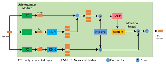 The self-attention mechanism can be regarded as the aggregation of information similar to its own characteristics in each part of the input sequence, in order to effectively obtain the long-distance contextual information of the input sequence. In this paper, the self-attention module used in the feature extraction process of point clouds is shown in Figure 1. It is worth noting that in Figure 1, we take a feature vector as the input in order to clearly illustrate the whole process of feature extraction using the self-attention (SA) module. First, each input point feature vector obtains query, key, and value through a fully-connected layer (FC). Next, each key and value can obtain the key and value corresponding to the nearest neighbor points in their local space range through K-Nearest Neighbor (KNN). Next, we make a slight change to Equation (1) with reference to PT [19], using subtraction of query and key to replace the dot product. We use the spatial distance between the surrounding neighbor points and the input point as the positional encoding. Finally, the weighted summation of attention scores and values is obtained to generate a new point-feature vector.