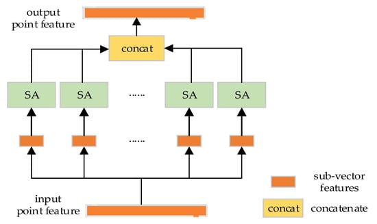 According to the Equation (2), we construct the module structure of the multi-head attention mechanism in our network, as shown in Figure 2. In general, a feature vector of the input point is split into sub-vector features. Next, they are sent to the self-attention mechanism module for feature extraction. Finally, the new sub-features obtained from each part are concatenated to obtain more abundant local aggregated features.