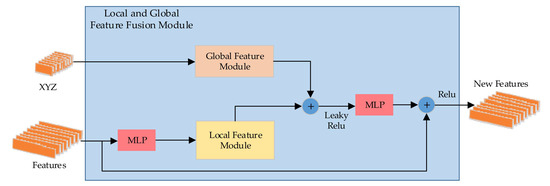 After obtaining local features and global features, we construct the local and global feature fusion (LGF) module to aggregate the two features to obtain more effective point cloud features. The architecture of the LGF module is shown in Figure 4. The inputs of the module are the coordinates and features of point clouds. The input coordinates of point clouds enter the global feature extraction module in Section 3.1, and the point cloud features enter the local feature extraction module in Section 3.2 via a one-layer MLP with one linear layer, one batch normalization layer, and one Relu activation layer. We send the local and global features output by two modules to the one-layer MLP through an activation function (Leaky Relu) for feature fusion. Next, we add the original input points and aggregated point features by using the residual connection. Finally, we obtain the final new features through an activation function (Relu), which effectively combine local and global feature information of point clouds.