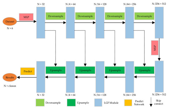 We embed the LGF module into the encoder–decoder network for 3D point cloud segmentation, and we can obtain the overall structure of our LLGF-Net, as shown in Figure 5. As can be seen from Figure 5, the encoder stage of the network corresponds to the process of downsampling and feature extraction, and the decoder stage corresponds to the process of upsampling and feature recovery. The inputs to the network are original point clouds, which contain XYZ and RGB; their feature size is N×6. After all input points pass through the one-layer MLP, they enter into downsampling and LGF module. The downsampling consists of three steps, including farthest point sampling (FPS), max-pooling, and the one-layer MLP. Next, the point features after downsampling at each layer are extracted by the LGF module. During the entire stage of the encoder, the number of point clouds is reduced from N to N/256 layer by layer, and the feature dimension is increased from 6 to 512. The output in the downsampling stage passes through the one-layer MLP and then enters the upsampling stage. The upsampling adopts the method of trilinear interpolation to restore the number of point clouds. We aggregate the point cloud features from the encoder stage with the sampled points by using the skip connection, after which the features are fed into the LGF module. The number of point clouds in the entire decoder stage is restored from N/256 to N, and the size of point cloud features is reduced from 512 to 32. Finally, we can obtain the category label of each point cloud through the prediction network constructed by the fully connected network.