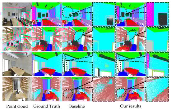 Quantitative results. In order to clearly compare with the results of mainstream algorithm networks, we test on area 5 of the dataset S3DIS and train on the remaining areas, in accordance the experimental strategy adopted by most methods on S3DIS. The quantitative experimental results of our method and other comparative methods are shown in Table 1. As can be seen from the table, our method achieves a mIoU metric of 68.0% and a mAcc metric of 74.4%, which is superior to other methods. In general, the semantic segmentation of indoor scenes is very difficult, especially in some categories that are difficult to distinguish, such as boards. In the S3DIS dataset, since the backgrounds of whiteboards are white walls, they are easily confused if the feature extraction is not sufficient. The quantitative results in Table 1 show that our method achieves a mIoU metric of 79.8% on boards, which is also the only method that can be used to achieve more than 70% of the results compared with other methods. In addition, the best segmentation results are obtained on categories such as ceilings, walls, columns, and tables.