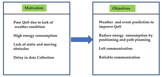 - To reduce the communication overhead in a multi-UAV environment by optimal path planning and positioning. The diagrammatical representation of motivation and objectives is presented in Figure 1 for a better understanding.