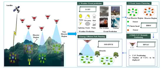 The proposed approach overcomes all the problems mentioned above by performing the following processes; initially, the prediction of weather conditions and recognition of disaster regions are achieved by using the LGRU model. Significant features, such as wind characteristics and temperature parameters, are utilized. The clustering of IoT devices is performed in which the devices in disaster and non-disaster regions are grouped based on density. This eventually optimizes the communication between the devices and UAVs. The satellite is in charge of locating UAVs in 3D space, determining the number of UAVs to be deployed, and positioning them using the DPSAC algorithm. Further, the energy consumption of the UAVs is minimized by planning their path. Considering obstacles in the environment makes it more realistic that our approach would be be adopted. The path loss is also reduced by utilizing the dynamic window model.