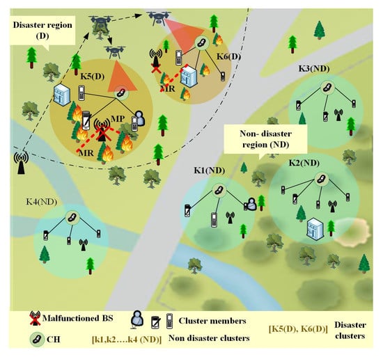 The 5G-enabled UAV communication reduces the communication latency and bandwidth issues; however, the conventional problems, such as increased energy consumption, are not yet addressed [7]. Clustering is a promising solution for energy consumption since it increases network scalability, reduces overhead, extends battery life, and boosts the throughput [8]. The optimal cluster head (CH) is selected for managing different user groups; bypassing the information through CH reduces the network delay [9]. However, current clustering schemes are required to construct frequently. This is due to the poor grouping of nodes based on limited parameters. In addition, UAVs are clustered without focusing on the vulnerability of the devices and base stations [10,11]. Data collection from disaster environments is challenging; using multiple UAVs requires proper positioning and efficient path planning [12,13]. However, deploying many UAVs without prior knowledge of traffic demand and event occurrence increases deployment costs. To reduce such drawbacks, relay-based methods and deployment algorithms are used [14,15]. Multiple constraints must be evaluated, including weather impact, traffic demand, coverage ratio, and emergency event counts. Based on these factors, the number of UAVs is considered, and is also helpful in planning an optimum path and effective deployment [16,17].