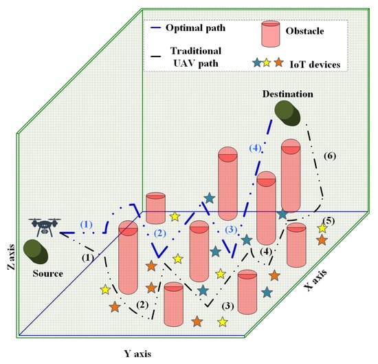 Unmanned aerial vehicles (UAVs) are highly demanding for various applications, such as rescue operations, surveillance, and disaster monitoring. Besides this, UAVs are also used to recover network facilities in the regions of natural disasters, such as forest fires, floods, cyclones, landslides, and manmade disasters, namely power plant explosions and terrorism, which can control emergencies when action is required [1]. In any area of interest, one or more UAVs are used for monitoring and collecting data from the ground devices equipped in that area. Each UAV has onboard sensors and cameras to collect data from the monitoring area. A UAV’s mission is to collect data from IoT devices in the absence of base stations or when a disaster damages the base stations. Therefore, UAV-based data collection and processing is a worldwide topic among researchers. The UAV collects data in air-to-air (A2A) and air-to-ground (A2G) communications. The base stations are prone to environmental conditions which affect the reliability of A2A and A2G UAV communication [2]. By utilizing flying base stations, the impact of weather and altitude on A2A and A2G communication is amplified, maximizing their energy consumption [3,4]. Less efficient path planning for UAVs leads to serious Quality of Service (QoS) issues, such as packet loss rate and network latency [5]. There is a lack of consideration for both static and moving obstacles and no differentiation between various emergency events, which reduces the performance and effectiveness of UAV communication [6].