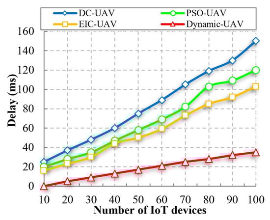 When the number of UAVs is increased to 10, the proposed Dynamic-UAV approach has a delay of 33 ms. On the other hand, DC-UAV, PSO-UAV, and EIC-UAV have delays of 130, 104, and 81 milliseconds, respectively. Our system experiences an average delay of 16.4 ms, validating its effectiveness. The average performance of each QoS metric is displayed in Table 5.
