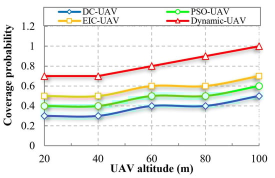 In Figure 12, it is demonstrated that as the altitude of UAVs increases, so does the likelihood of coverage. Since the DPSAC algorithm considers several different parameters while positioning multi-UAVs, the proposed Dynamic-UAV method achieves a high probability of coverage in comparison to previous techniques as a result.