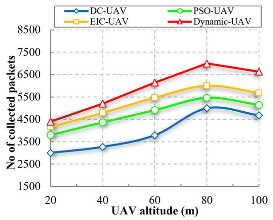 Figure 14 depicts the correlation between UAV altitude and the number of collected packets. From Figure 14, it is clear that the packet collection rate grows linearly with the increasing altitude of UAVs up to 80 m. The graph declines after 80 m (the saturation threshold) since the UAV is designed to fly only up to 80 m. Due to event/weather predictions and multi-UAV placement, the Dynamic-UAV technique achieves a large number of collected packets even at that height.