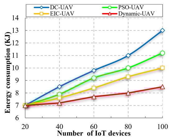 We computed the total energy consumed by the IoT devices. Figure 15 represents the comparison of energy consumption to the number of IoT devices. Figure 15 demonstrates that, as the number of IoT devices increases, so does their energy consumption. However, the Dynamic-UAV approach reduces energy consumption due to event/weather prediction, event-based clustering, and multi-UAV positioning. Predicting weather/events using the LGRU algorithm and event-aware clustering using the DB-OPTICS method minimizes energy consumption under extreme weather conditions. DPSAC-based multi-UAV positioning finds the suitable altitude for UAVs, decreasing the energy consumption and minimizing the delay significantly.