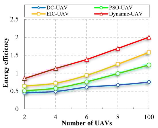 Energy efficiency is known as the minimum amount of energy consumed when the number of UAV devices increases. A perfect system must have high energy efficiency. More devices with low energy consumption lead to high energy efficiency. The energy efficiency is calculated by: