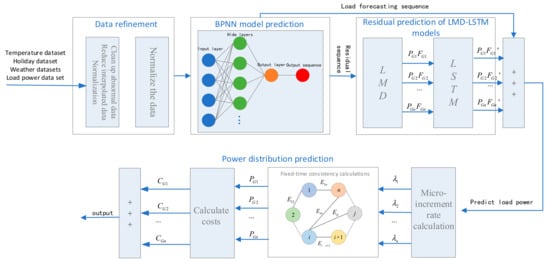 Because the power load in the microgrid is affected by a variety of factors, such as weather, electricity prices, time factors, random factors, etc., the above factors are divided into major and secondary influencing factors, and all the data are entered into the BPNN model through data refinement for prediction. Since the residual value between the predicted value of the BPNN model and the actual value is generated, the LMD–LSTM model is established to predict the residual value, and the predicted value of the BPNN model is added to obtain the final prediction load. Based on the BPNN–LMD–LSTM model, the short-term load forecast establishes the supply and demand balance constraint, and the slight increase rate of each power generation unit is calculated by using the Lagrange multiplier method. Moreover, through the principle of micro-increment rate consistency, considering the time delay problem, a fixed-time consistency algorithm with random delay is proposed for microgrid power distribution, thereby predicting the power generation cost of the microgrid. The economic dispatch process based on microgrid load forecasting is shown in Figure 1.