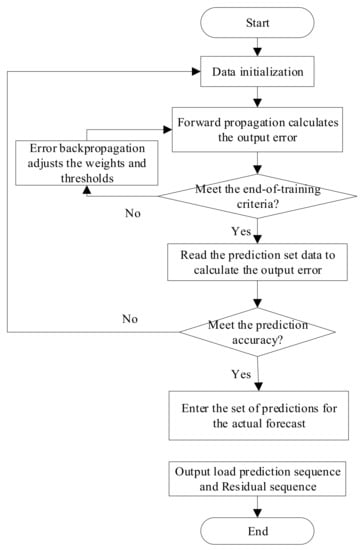 The initial weight is set to , the number of hidden nodes in the hidden layer of the network is l, the activation function is f, and the model uses a gradient descent algorithm to supervise the training. When the prediction accuracy of the model is less than a certain error, the prediction set is entered into the network to calculate the load forecast sequence for the next 7 days. is the residual sequence, that is, the difference between the predicted power load series and the actual power load value. Figure 2 shows the BPNN forecast flowchart.