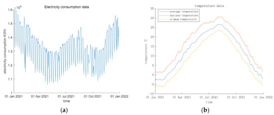 Load and temperature change in 2021. (a) Urban daily load change curve in 2021; (b) Temperature change curve of a city in 2021.