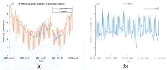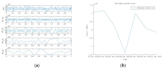 The prediction series and the prediction residuals series are derived from the BPNN model and the LMD–LSTM model, respectively. Taking the prediction of the power load for the next 7 days as an example, can be obtained.