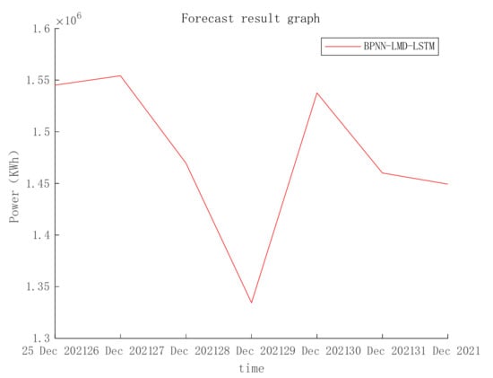 Taking the prediction of a 7-day microgrid load as an example, BPNN–LMD–LSTM is used to predict the sum of load PFs, as shown in Figure 8. Among them, the forecast load on 25 December 2021 , the forecast load on 26 December 2021 , the forecast load on 27 December 2021 , the forecast load on 28 December 2021 , the forecast load on 29 December 2021 , the forecast load on 30 December 2021 , and the forecast load on 31 December 2021.