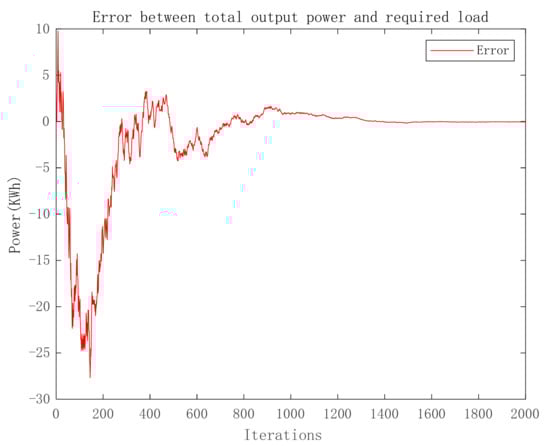Taking the forecast load on 25 December 2021 as an example for microgrid economic dispatching, to reflect the randomness of the delay, the value of representing each sampling time is added. Its mathematical expectation is the random probability of system communication without delay . Figure 10 shows an error between the total output power and the required load. Figure 11 shows the output power distribution of each power generation; then, the system meets the supply and demand balance constraints to distribute power. The power distribution of the microgrid at the lowest cost is shown in Figure 12a, and the total cost of the output power of each power generation unit is shown in Figure 12b.