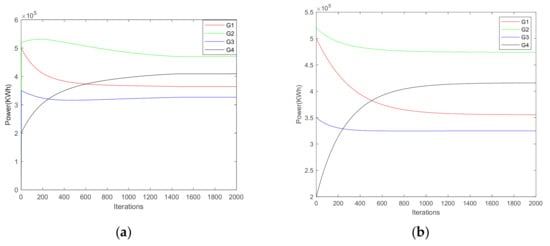 From the comparison of Figure 14a,b, it can be obtained that the classical time consistency with random delay converges at 1794 iterations, while the fixed-time consistency with random delay converges at 1505 iterations. It can be obtained that the algorithm proposed in this paper can solve the problem of slow convergence speed and improve the speed of dispatch while keeping the cost of microgrids to a minimum.