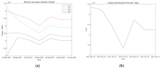 The minimum power is its power distribution. (a) Microgrid power distribution at the lowest cost; (b) The lowest cost of microgrid output power for the next 7 days.