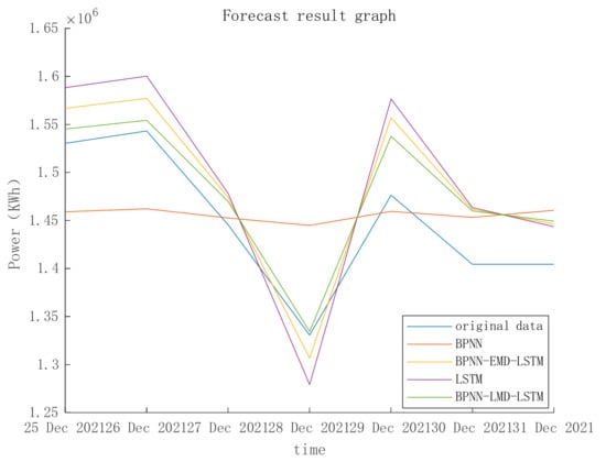 To verify the accuracy of the prediction results of the proposed method, the same load data were predicted by using the BPNN model, the LSTM model, and the BPNN–EMD–LSTM model. A comparison of the four models is shown in Figure 13.