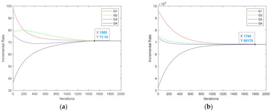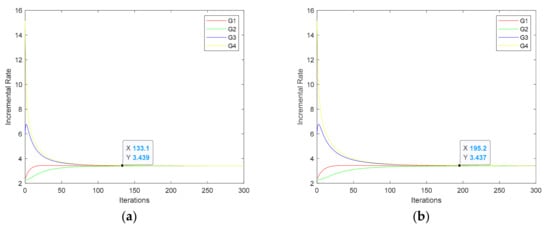 The rate of micro-increase. (a) The rate of micro-increase in fixed-time consistency at the random delay; (b) The rate of the Classical consensus algorithm at the random delay.