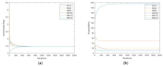 The incremental cost of fixed-time consistency is shown in Figure 19, where the micro-increment rate converges after 704 iterations, and the individual micro-increment rates reach a consensus. The optimal economic dispatch is thus achieved, and the power distribution is MWh, MWh, MWh, MWh, MWh, MWh.