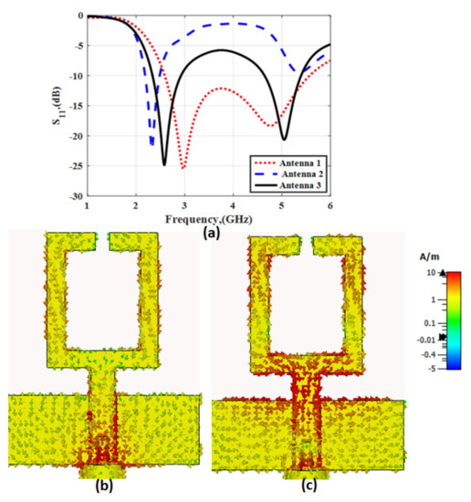 The CPW monopole antennas: (a) Simulated S11 results; (b) antenna 3 current distribution at 2.6 GHz; (c) antenna 3 current distribution at 5 GHz.
