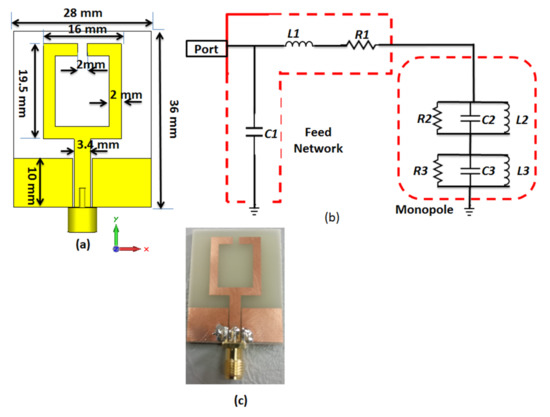 CPW monopole antenna structure: (a) 2-D configuration; (b) equivalent circuit with the simplified model (where R1 = 3.097 Ω, R2 = 87.13 Ω, R3 = 76.24 Ω, L1 = 1.73 nH, L2 = 1.486 nH, L3 = 0.793 nH, C1 = 0.05 pF, C2 = 3.22 pF, C3 = 1.59 pF); (c) fabricated prototype.
