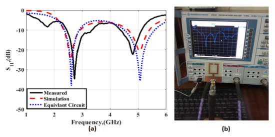 The CPW dual−band monopole antenna: (a) Simulated, equivalent circuit, and measured S11 results; (b) measured S11 results with VNA.