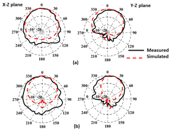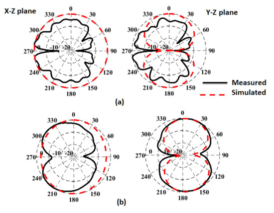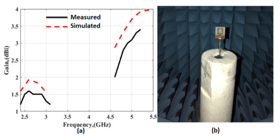 The radiation patterns for the simulated and measured results (normalized) in both the x-z and y-z planes at 2.45 GHz and 4.8 GHz are illustrated in Figure 5. The antenna was tested inside an anechoic chamber as displayed in Figure 6. It is seen that the antenna achieves a semi-omnidirectional pattern in the x-z plane and a bidirectional one in the y-z plane. Moreover, the two results have the same trend, which confirms the performance of the antenna. Figure 6 shows the simulated and tested peak gain of the antenna. The antenna has simulated peak gain of around 1.8 dBi and 3.5 dBi at the operating two bands, while it has tested peak gain around 1.5 dBi and 3 dBi for both bands.