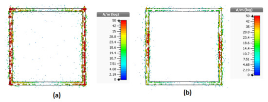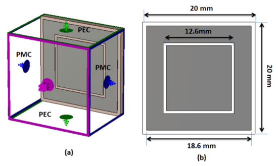 To enhance antenna gain and achieve directional patterns without increasing antenna size and other elements, a perfect electric conductor (PEC) reflector structure has been utilized [16,17]; however, the PEC should be placed at around 1/4 λ0 from the antenna, increasing the antenna size. To solve this problem and preserve a low antenna size, the AMC reflector structure can be used at distance lower than 1/4 λ0. The AMC reflector has in-phase reflection, like a perfect magnetic conductor (PMC), and, as such, a small gap can be utilized [3,13,14,18,19,20,21,22,23,24,25]. The desired gain, reflection coefficient, and frequency bands can be achieved by properly adjusting the AMC gap from the antenna, AMC array size, and AMC shape.