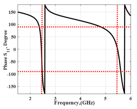 The 2-D and 3-D layouts of the dual bands AMC unit cell are displayed in Figure 7. It is composed of a slotted outer patch and an inner patch on the top and ground on the bottom of the cell. The optimized dimensions of the unit cell are shown in Figure 7b, while the utilized boundary condition is shown in Figure 7a. The two frequency bands are controlled by changing the dimensions of the unit cell which changes the inductance/capacitance of the structure. The same previous substrate is used in the design. Figure 8 illustrates the reflection phase of the unit cell. It is seen that the reflection achieves a 0° phase at 2.45 GHz, 5.4 GHz, +90° at 2.34 GHz, and 4.7 GHz, while a −90° phase is achieved at 2.48 GHz and 5.6 GHz (the operating band of the AMC). Figure 9 shows the distribution of the surface current at 2.45 GHz and 4.8 GHz to know the mechanism of operation. It is noted that the current is concentrated around the outer patch for the first band and around the inner patch for the second band.