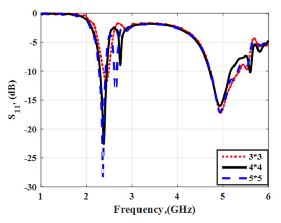 The CPW-fed dual-band antenna discussed in the previous section was backed with AMC cells and placed at a distance (X) from the antenna as illustrated in Figure 10. Parametric studies as a function of the array size and array separation (X) were investigated. The effects of cell sizes of 3 × 3, 4 × 4, and 5 × 5 with a distance X = 8 mm on the reflection coefficient and the gain were studied. It was seen that by increasing the array size, the impedance matching in both bands was improved, while a second resonance around 2.7 GHz appeared as shown in Figure 11. Table 1 shows the effect of the cell size on the antenna gain. The gain of the proposed antenna with the AMC is increased with increasing the cell size. It increases by around 1 dBi in both bands by increasing the cell size from 3 × 3 to 5 × 5. The optimized cell size was chosen to be 4 × 4. This cell size achieved a good reflection coefficient and suitable gain at both bands.