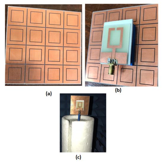 The suggested antenna with AMC was fabricated and tested. An 8 mm layer of polystyrene where εr = 1.03 was utilized for separation between the antenna and AMC cell. Figure 13a shows the fabricated prototype of AMC cells and Figure 13b illustrates the proposed antenna integrated with the AMC structures.