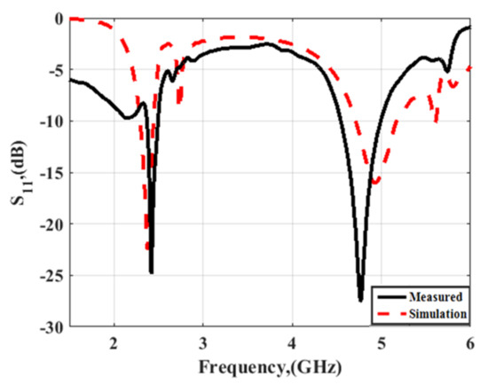 The S11 simulated and tested results are shown in Figure 14. The simulated results were gathered for both bands, where the first one has a center frequency of 2.38 and bandwidth from 2.29 GHz to 2.45 GHz and the second has a center frequency of 4.93 GHz and bandwidth from 4.6 GHz to 5.2 GHz. While the first band from the tested results has a center frequency of 2.41 GHz and bandwidth from 2.37–2.5 GHz, the second one has a center frequency of 4.7 GHz and bandwidth from 4.5 GHz to 4.99 GHz. From Figure 14, it is obvious that there is a shift between the two results. This is because many factors, such as the small shift introduced by the antenna without the AMC, as discussed in the previous section, can be a source of error, in addition to the fabrication process and human error introduced by misalignment between the antenna and AMC.