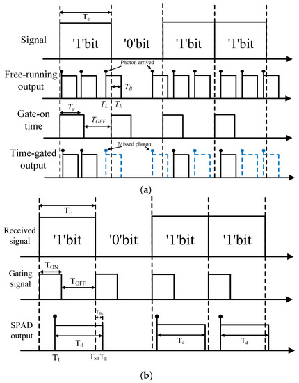 The difference between the free-running scheme and the time-gated scheme is whether there are additional time-gated signals. For the time-gated SPAD, photon detection only occurs in the gate-ON time, and the photons cannot be detected at the gate-OFF time. The output of the free-running SPAD and the time-gated SPAD is shown in Figure 1a, the blue dashed portion represents the missed photons. It is worth noting that for AQ-SPAD, regardless of whether the external gating signal is turned on, it cannot detect photons before the end of the dead time. Setting gate-ON time can effectively reduce the error count caused by background photons and alleviate ISI distortion [20].