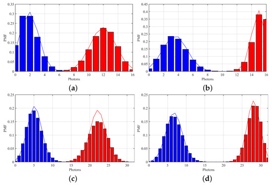 The probability mass function of time-gated SPAD array, the distribution of “1” signal and “0” signal is shown in red and blue respectively. (, , = , = ). (a) . (b) . (c) . (d) .