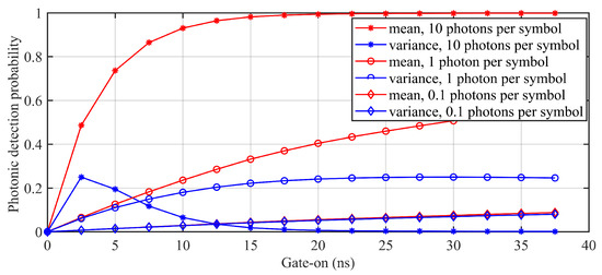 Figure 3 shows the effect of gate-ON time on the photon detection probability and variance of SPAD. We use photon detection probability and variance as the research objects. The ratio of photon detection probability and variance can be approximately regarded as the signal-to-noise ratio of the time-gated SPAD receiver. When the photon flux is weak, increasing the incident photon can improve the photon detection probability of the SPAD. This is because that low photon flux is the main reason affecting the performance of time-gated AQ-SPAD. Increasing the gate-ON time can effectively improve the photon flux. The detection performance of SPAD increases with the rises of gate-ON time. With the rise of incident photon flux, the photon detection probability of SPAD still benefits from the rise of gate-ON time, and the variance of detection probability tends to be stable. Increasing the gate-ON time is beneficial to the performance of time-gated SPAD. Further increasing photon flux and gate-ON time, the promotion of the SPAD receiver detection performance is no longer significant. SPAD only requires a shorter gate-ON time to meet the detection performance requirements, the variance is slight, and the statistical characteristics of photons are better. Therefore, when the photon flux is weak, the gate-ON time can be increased to enhance the detection performance of the SPAD. When the photon flux is intense, the time-gated SPAD can be optimized without loss of performance by selecting a reasonable gate-ON time.