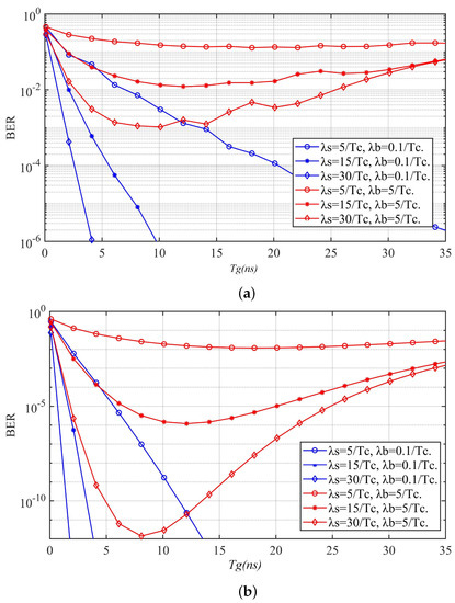 In order to solve the optimization problem, according to Equations (6) and (7), the random variable blocking time vectors also affects the optimal gated-ON time in addition to and . ISI distortion can only be eliminated when the gate-OFF time exceeds the blocking time. In addition, the concavity and convexity of the BER function are affected by and . In this paper, the optimal gate-ON time is obtained by numerical simulation, and the accuracy of the results is verified.