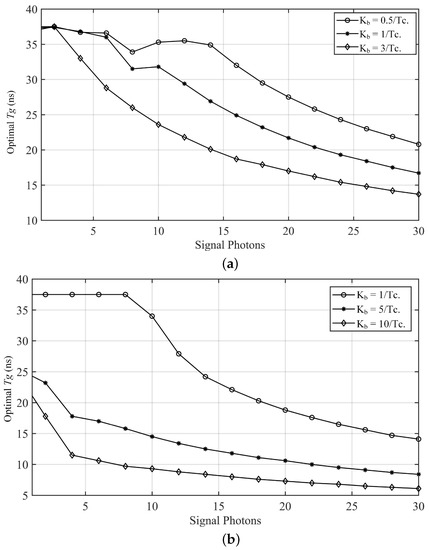 In order to obtain the optimal gate-ON time, the background photon flux of different intensities is selected. Signal photons are independent variables, and the optimal gate-ON time is obtained by numerical simulation. The results are shown in Figure 6. When the signal photon flux and background photon flux are weak, the gate-ON time is the main factor affecting the performance of the SPAD receiver, and the shorter gate-ON time will affect the photons incidence, the optimal gate-ON time is the symbol time .
