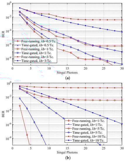 In order to further illustrate the results of Figure 6, the BER performance of gated mode and free-running mode is compared, and the results are shown in Figure 7. The gated mode is operated in the optimal gate-ON time, and the free-running mode does not have an additional external gate signal, the SPAD can be exposed in the whole symbol cycle. When the signal flux is low, the performance of a free-running SPAD is equivalent to the time-gated SPAD. With the increase of signal photon flux, the BER of the free-running SPAD receiver decreases and reaches the lower limit. The lowest BER of free-running AQ-SPAD is determined by the background light. For time-gated SPAD, the performance is equivalent to free-running mode at low signal light flux. As the signal increases, the BER of free-running SPAD achieves the lower limit. The BER of the time-gated SPAD decreases monotonously, the background light has a small impact, and the time-gated SPAD can achieve a lower BER.